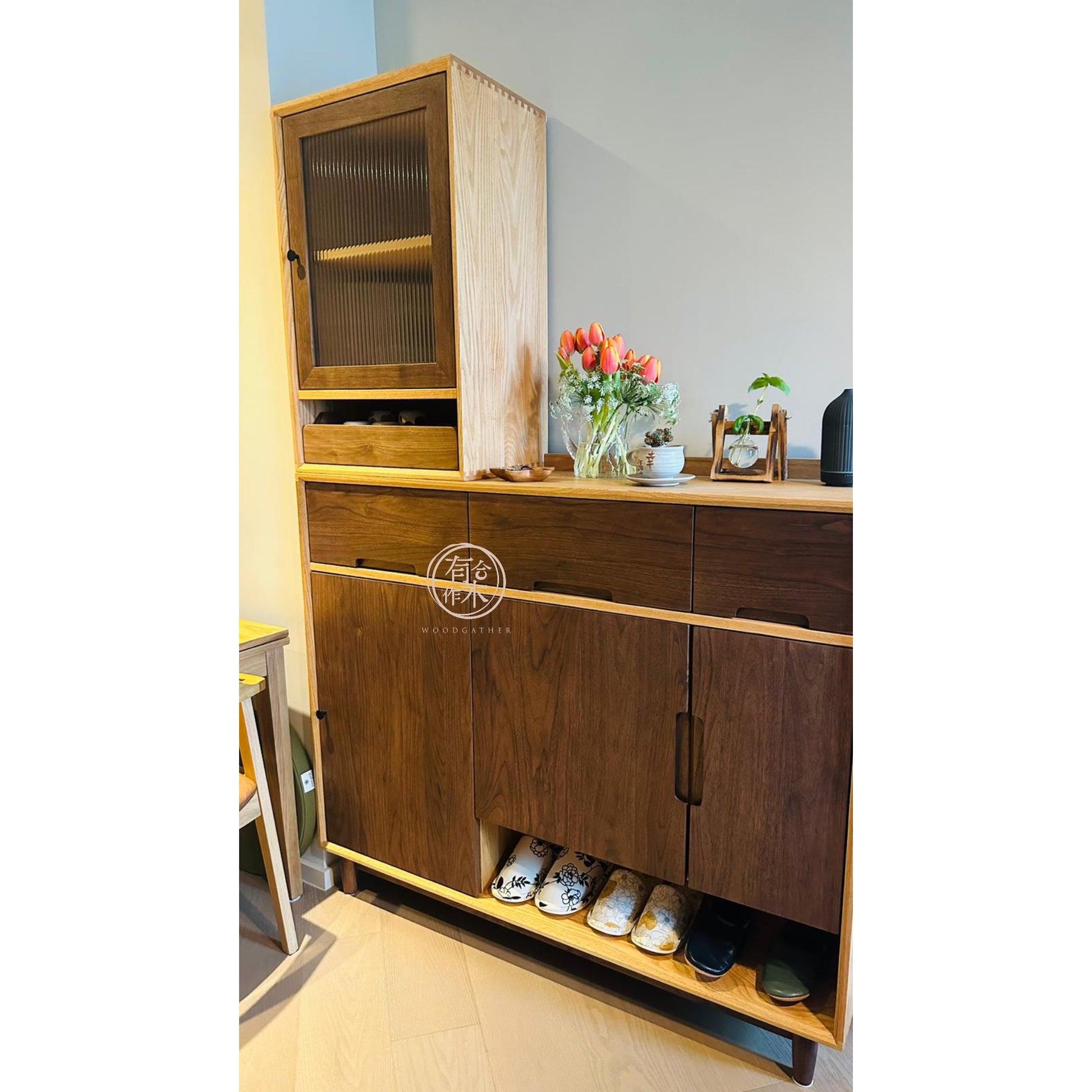 實木邊櫃、鞋櫃,櫃身以美國橡木(Oak) ,櫃門以美國胡桃木製作。客人想提升傢俬靈活性,上方的杯櫃,跟下方的鞋櫃(儲物櫃)是可分開的,將來若果想調換至家中其他位置擺放也十分方便。