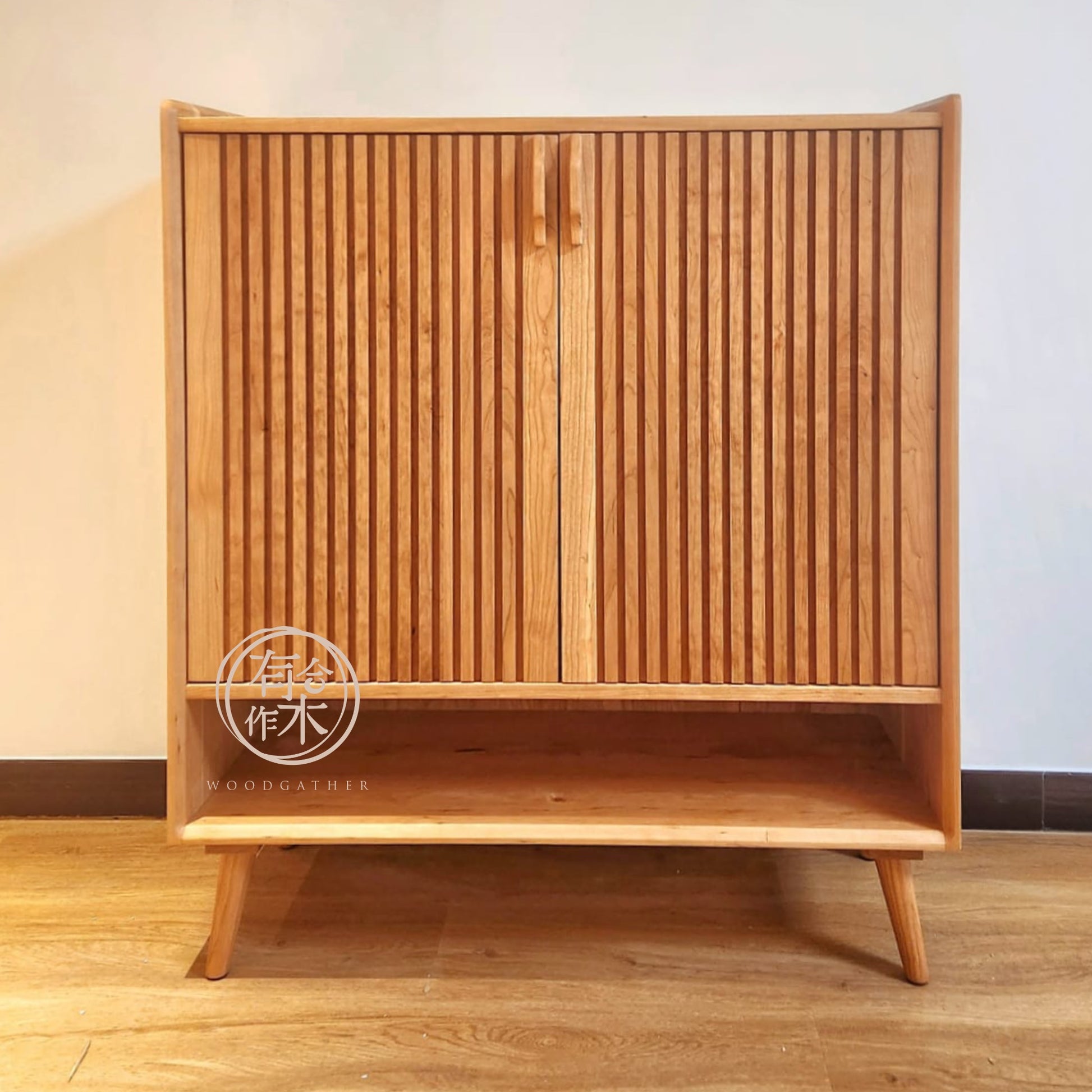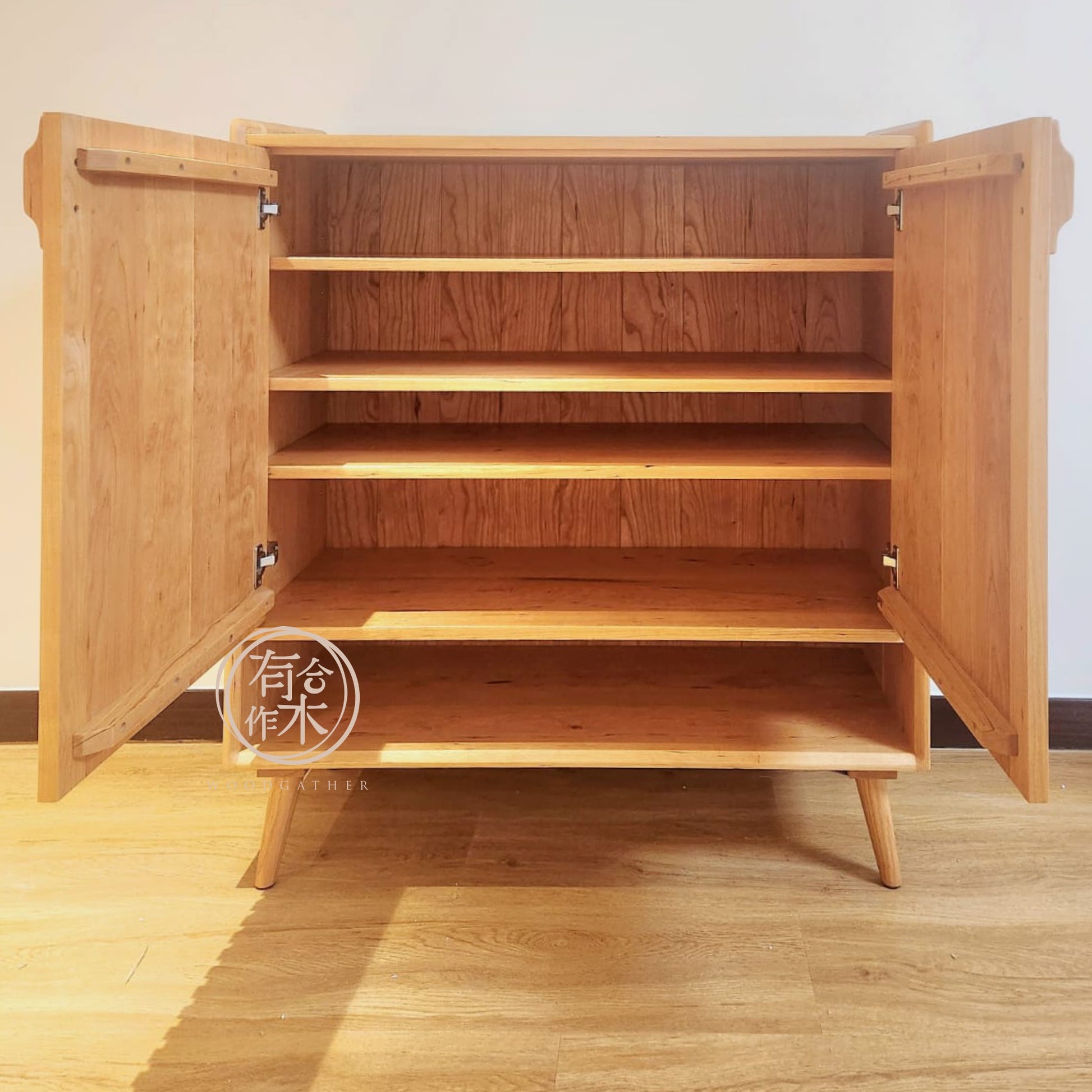 實木鞋櫃,以美國櫻桃木(Cherry Wood)製作 。木揭門仿效捲簾樣式,造了真條坑紋。打開櫃門後,內籠有3塊可調節高度的層板。