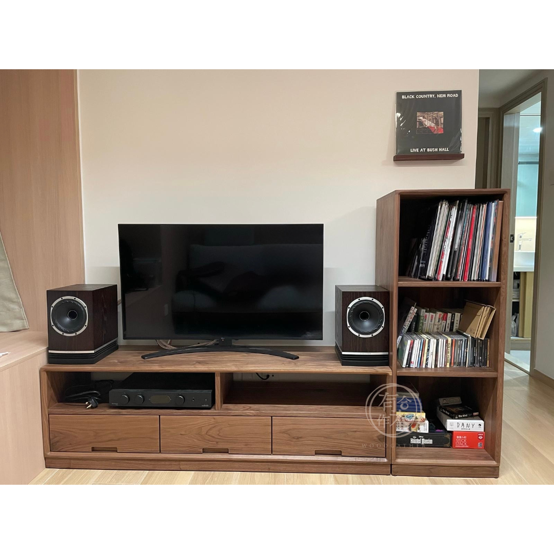 實木電視櫃,以美國胡桃木(American Walnut)製作。中空層提供大空間擺放電子器材,下方3個大櫃桶,能有效分類作客廳收納之用。