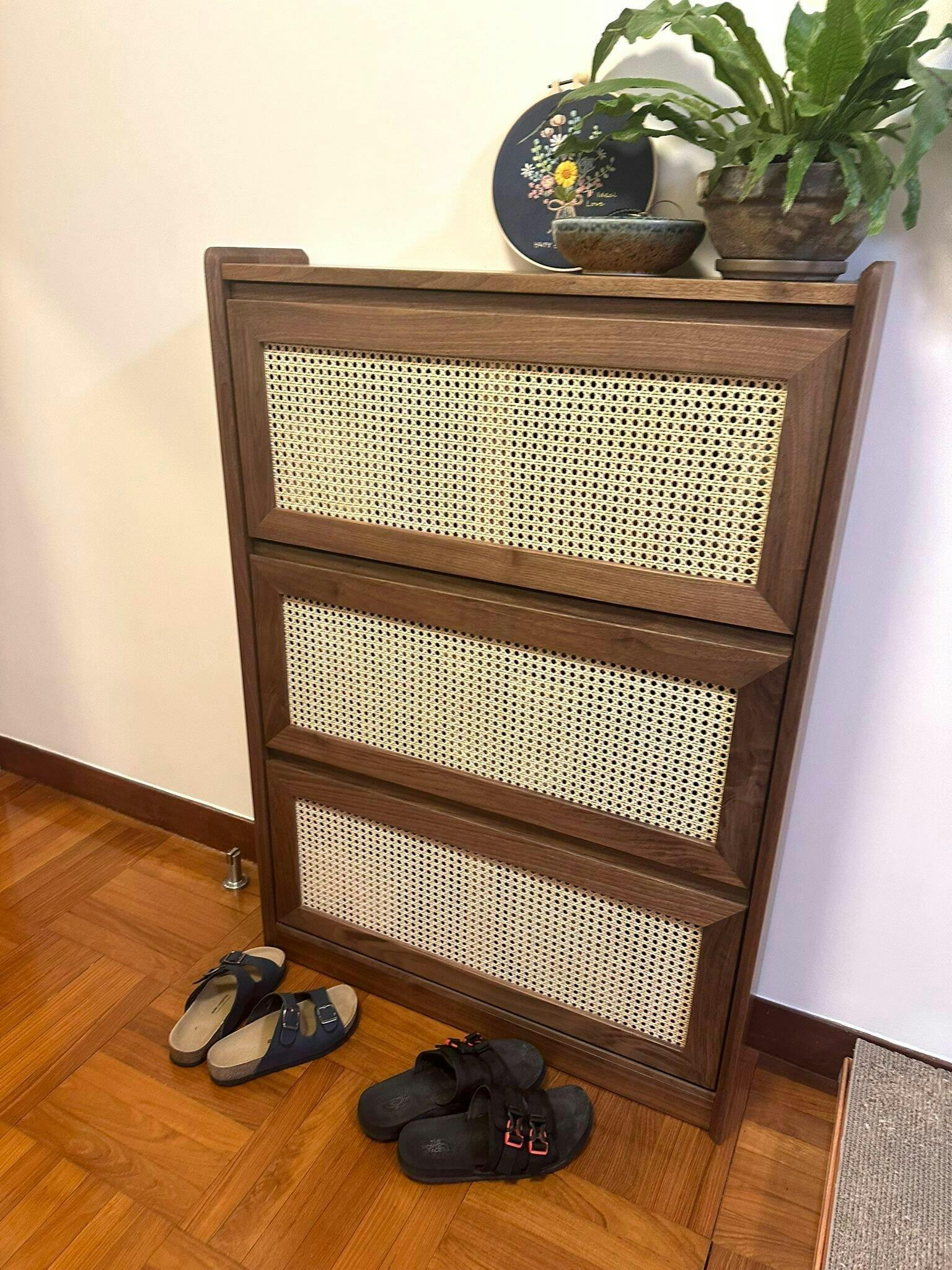 The solid wood shoe cabinet is made of American walnut/natural rattan fabric . The flip-door design and thin cabinet body (depth: 20cm) can save space and can hold about 9-12 pairs of shoes. The cabinet doors can be designed with full rattan fabric or transformed into full wooden doors. There is a reserved footing position on the back of the cabinet, so it can be easily placed on the wall!