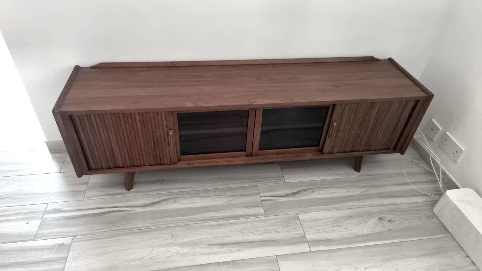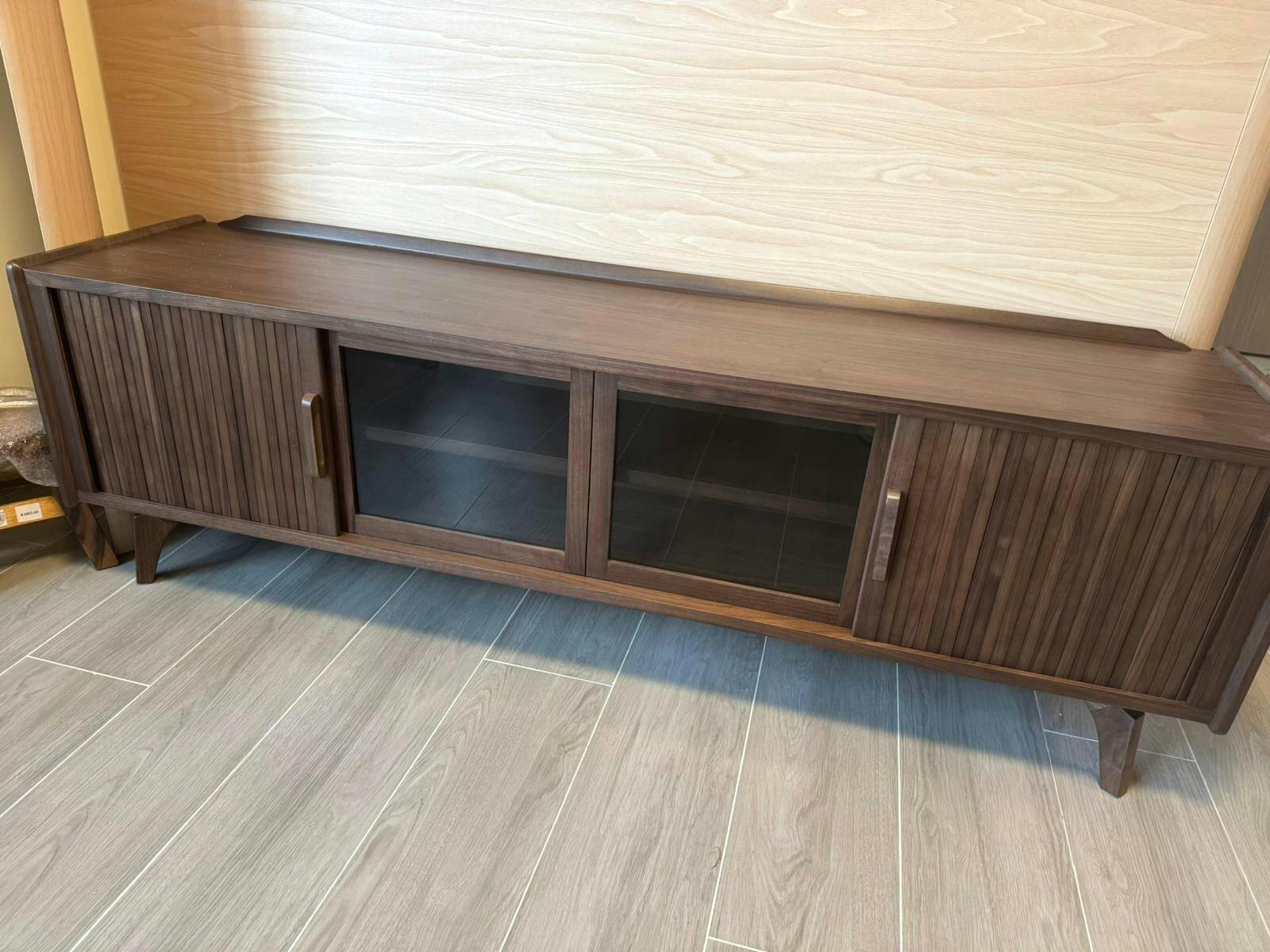 Solid wood TV cabinet, made of American oak (Oak) or walnut (Walnut), with 3 different sizes to choose from. The picture shows the walnut style. There is a wooden rolling door on the outermost layer, which opens to reveal two storage spaces. There is a glass sliding door in the middle, which can be accessed to the left and right sides. There is a layer of panels behind the glass door, which can be removed to expand the space. There are wires on both sides of the back of the TV cabinet. The three side panels of the TV cabinet are high to prevent small objects on the cabinet from scattering on the floor.