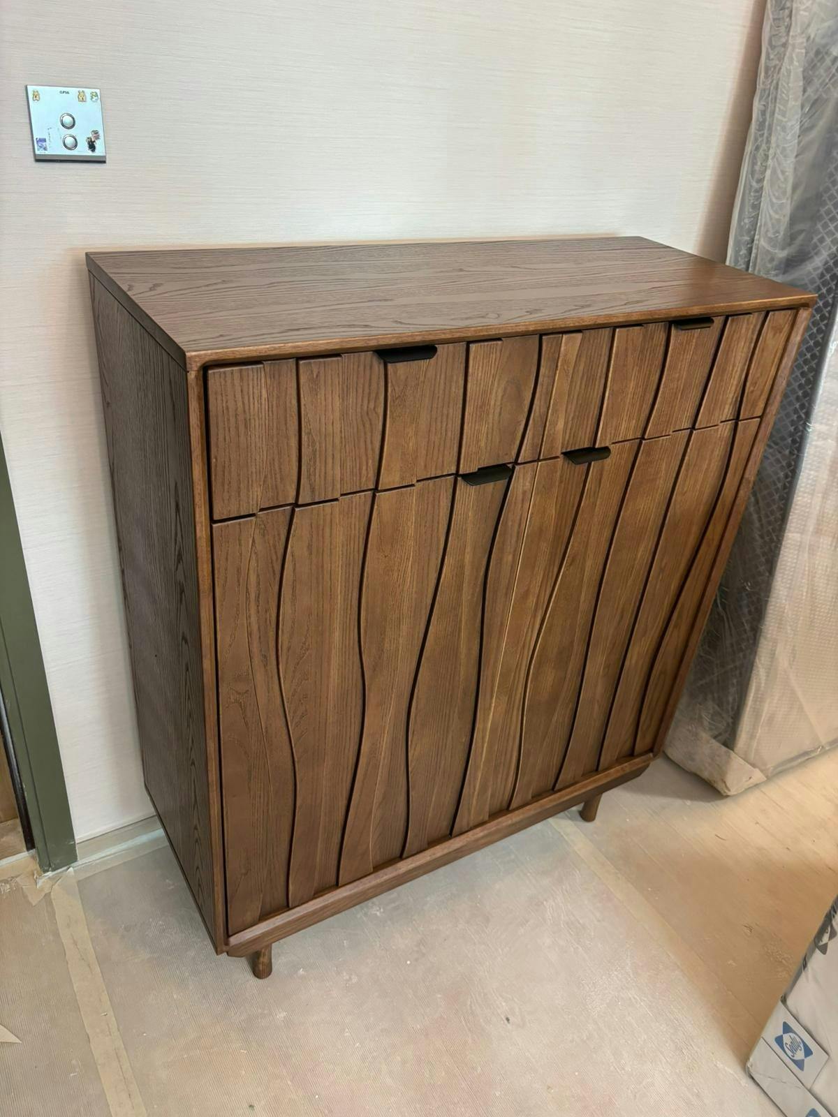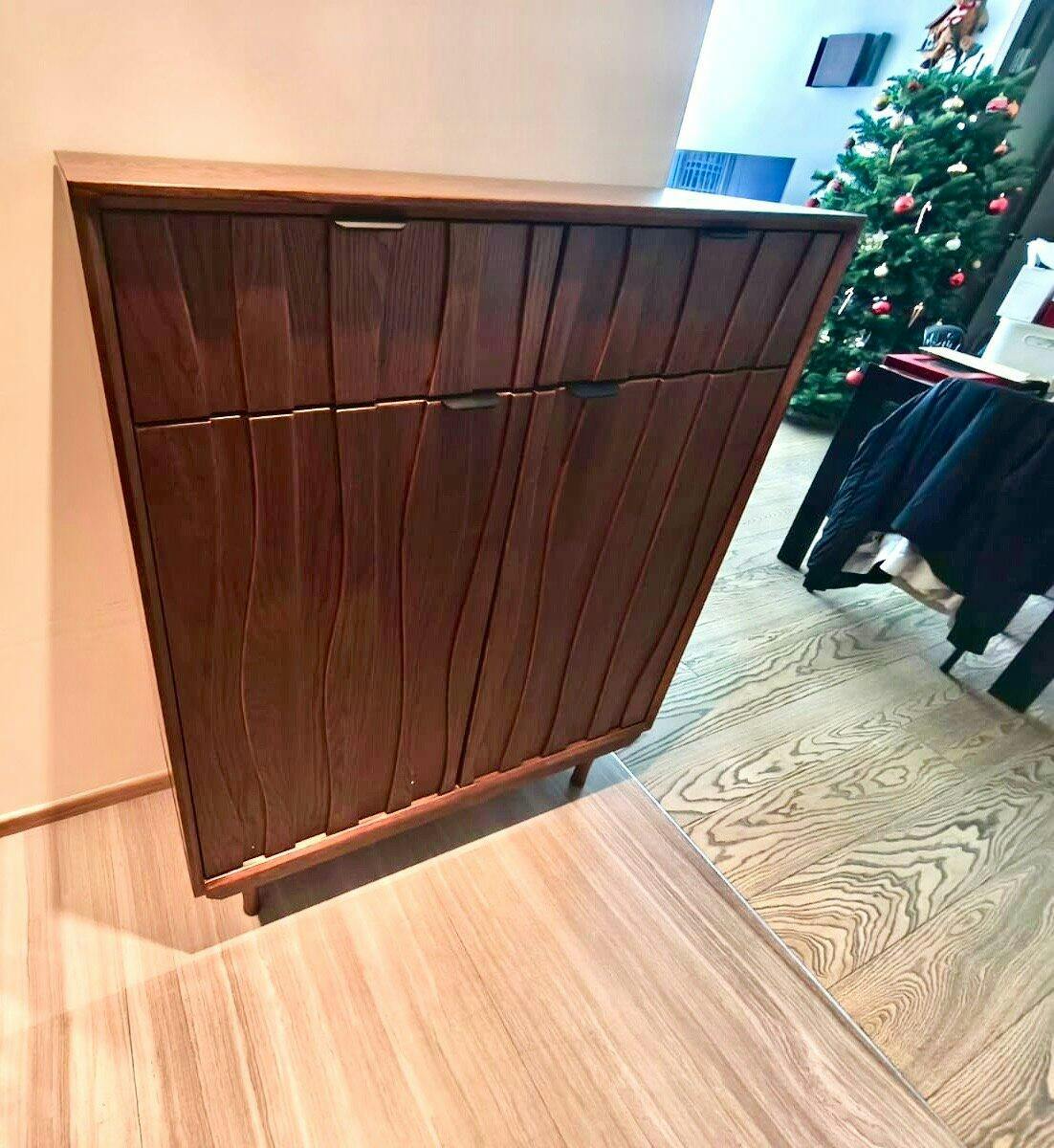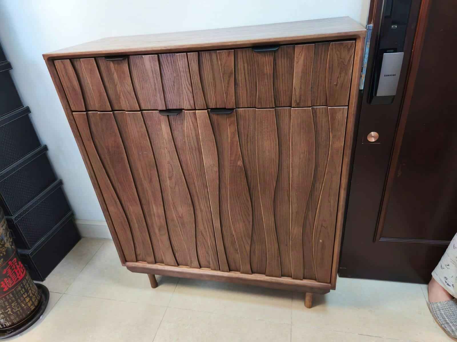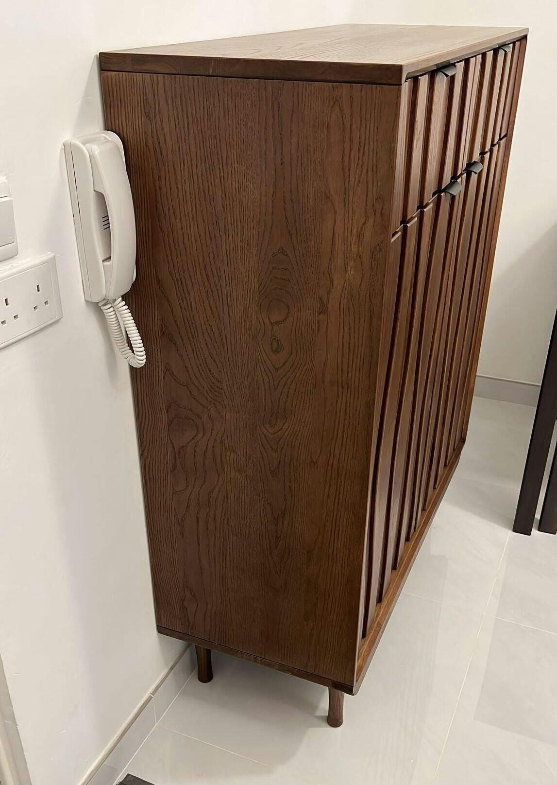 實木鞋櫃,馬來西亞橡膠木(Malaysian Rubber Wood)製作,表面為白蠟木貼皮。上面是兩個小櫃桶,方便存放出門小物;下面是木開門,櫃內有活動層板存放鞋子。
