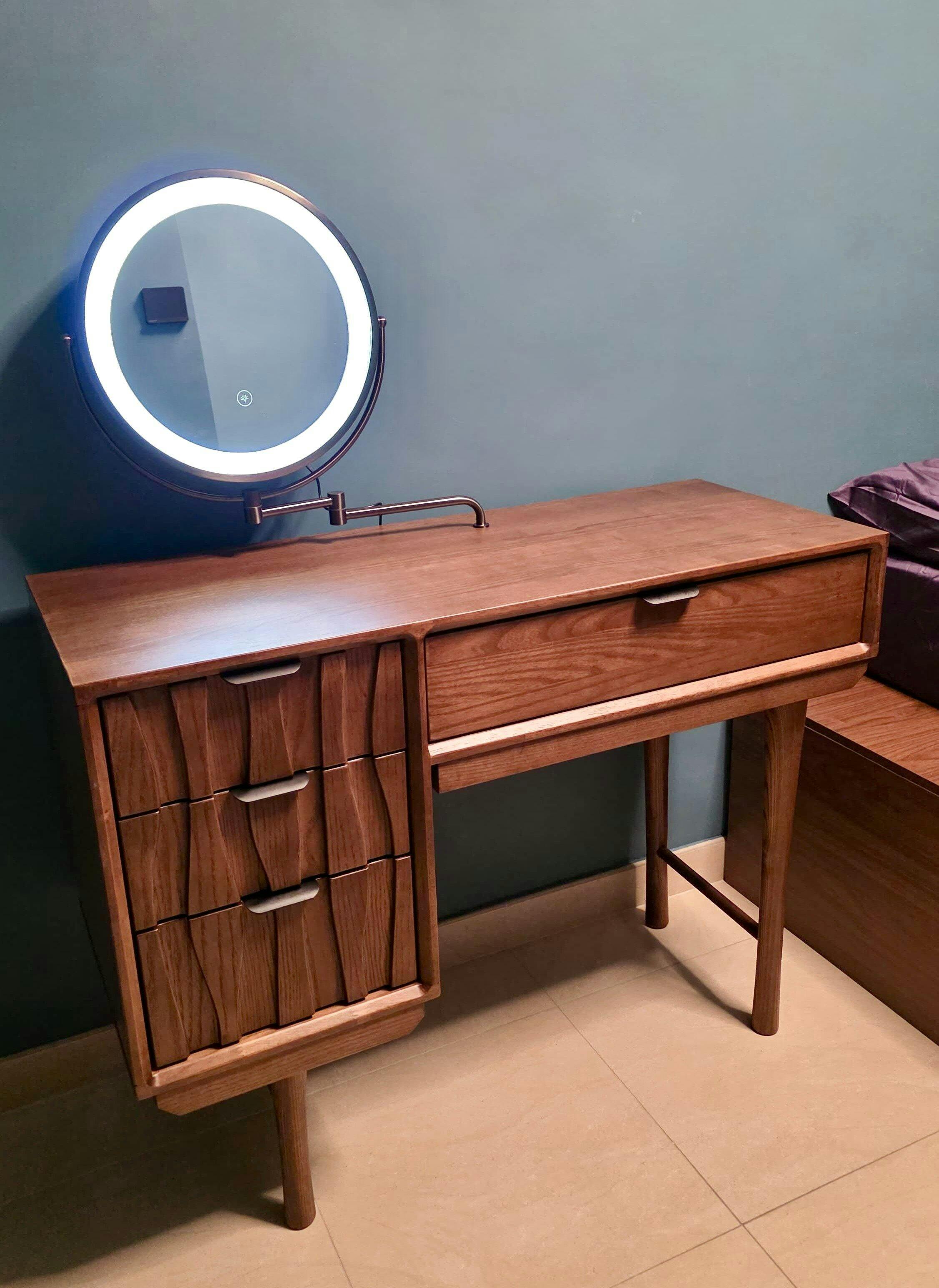 實木梳妝枱,馬來西亞橡膠木(Malaysian Rubber Wood)製作,表面為白蠟木貼皮。圓形飾鏡及單邊櫃桶門用上木雕刻設計,令設計更富時尚感。
