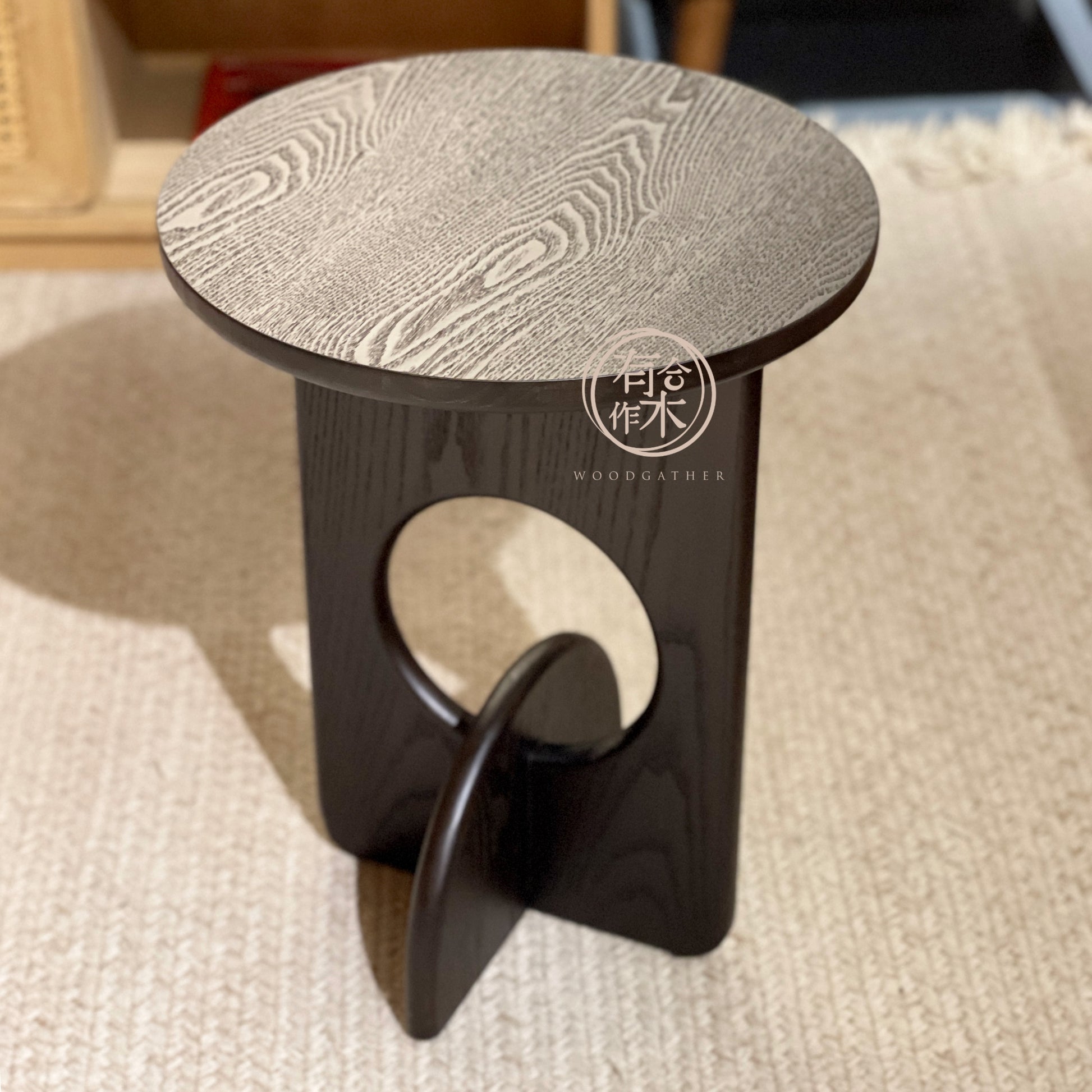 實木圓形邊几 / 茶几,由白蠟木(Ash)製作。圓形及較小尺寸,很適合小家庭使用。枱下的中空板腳設計簡單卻不平凡,無論放在哪處都能提升裝飾感。