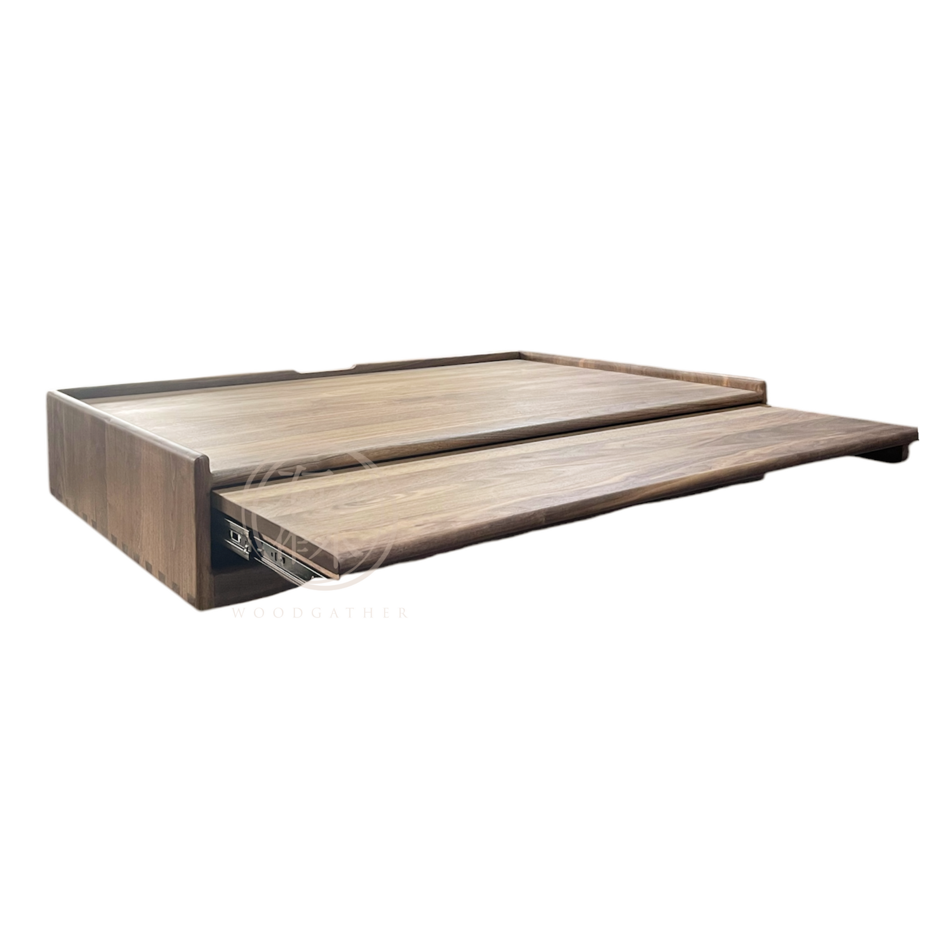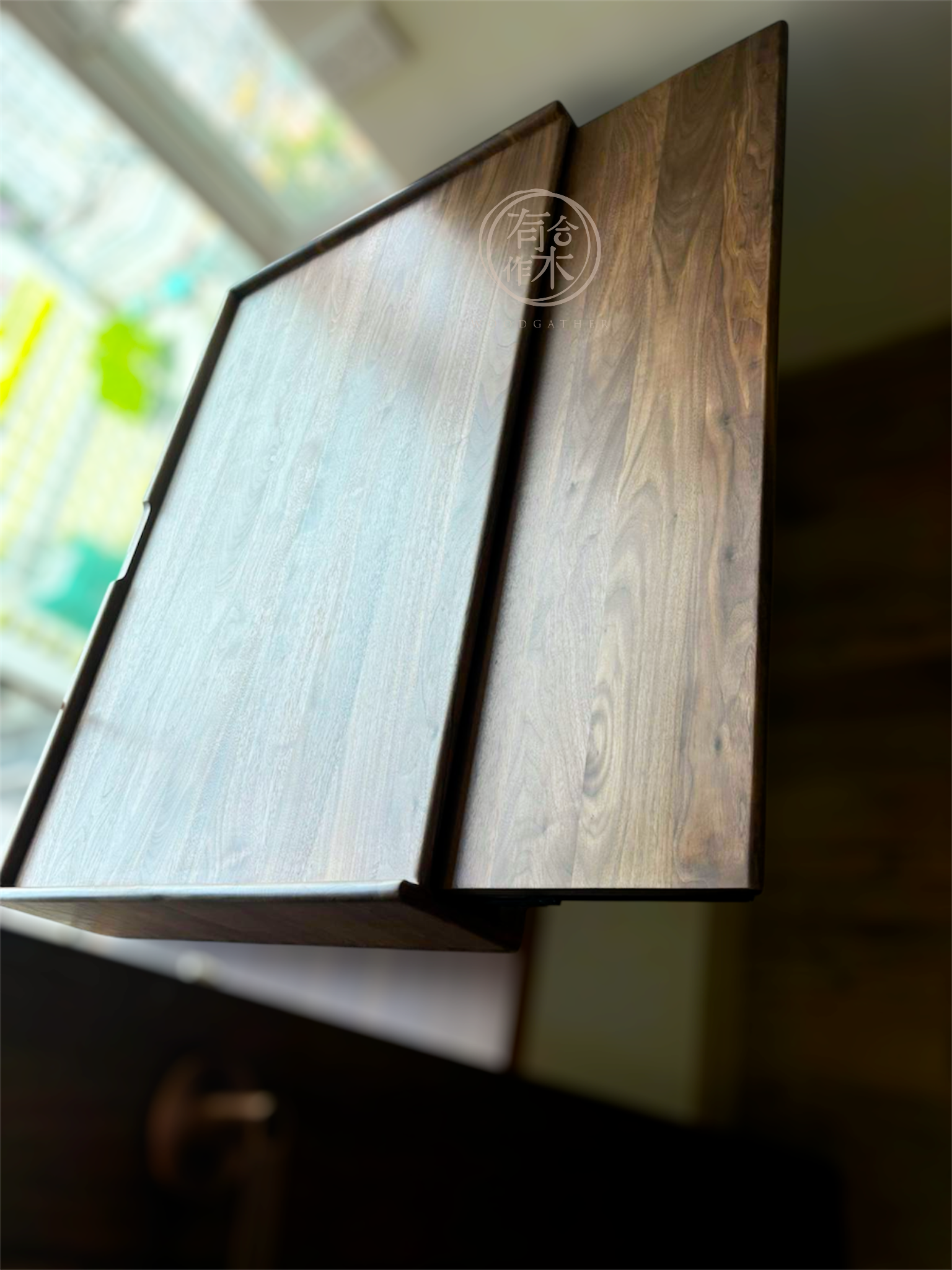 實木窗台書枱,以美國胡桃木(American Walnut)製作。書枱有可延伸的部分,使用時可擴大桌面,有效活用窗台空間,利用窗邊自然光工作更醒神!