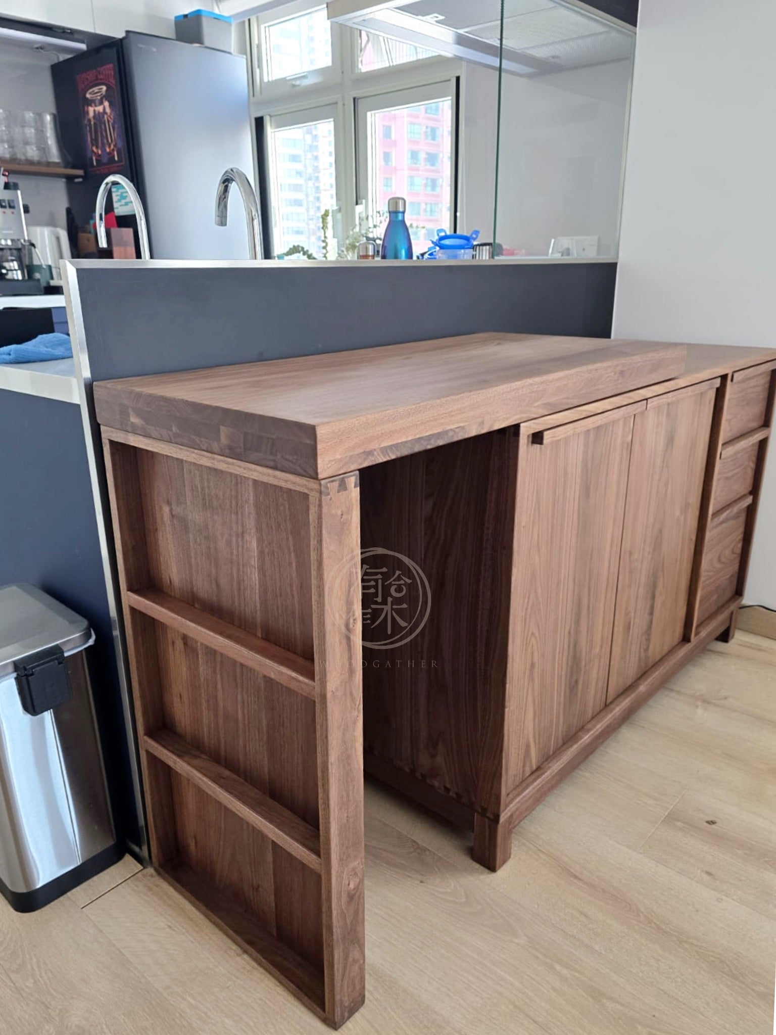 實木L形書枱連儲物櫃,以美國胡桃木(American Walnut)製作。 書枱部份可以隨意調整方向,方便不同情況使用。客人在櫃身劃分出開門與櫃桶兩部份, 配合自己的收納習慣!