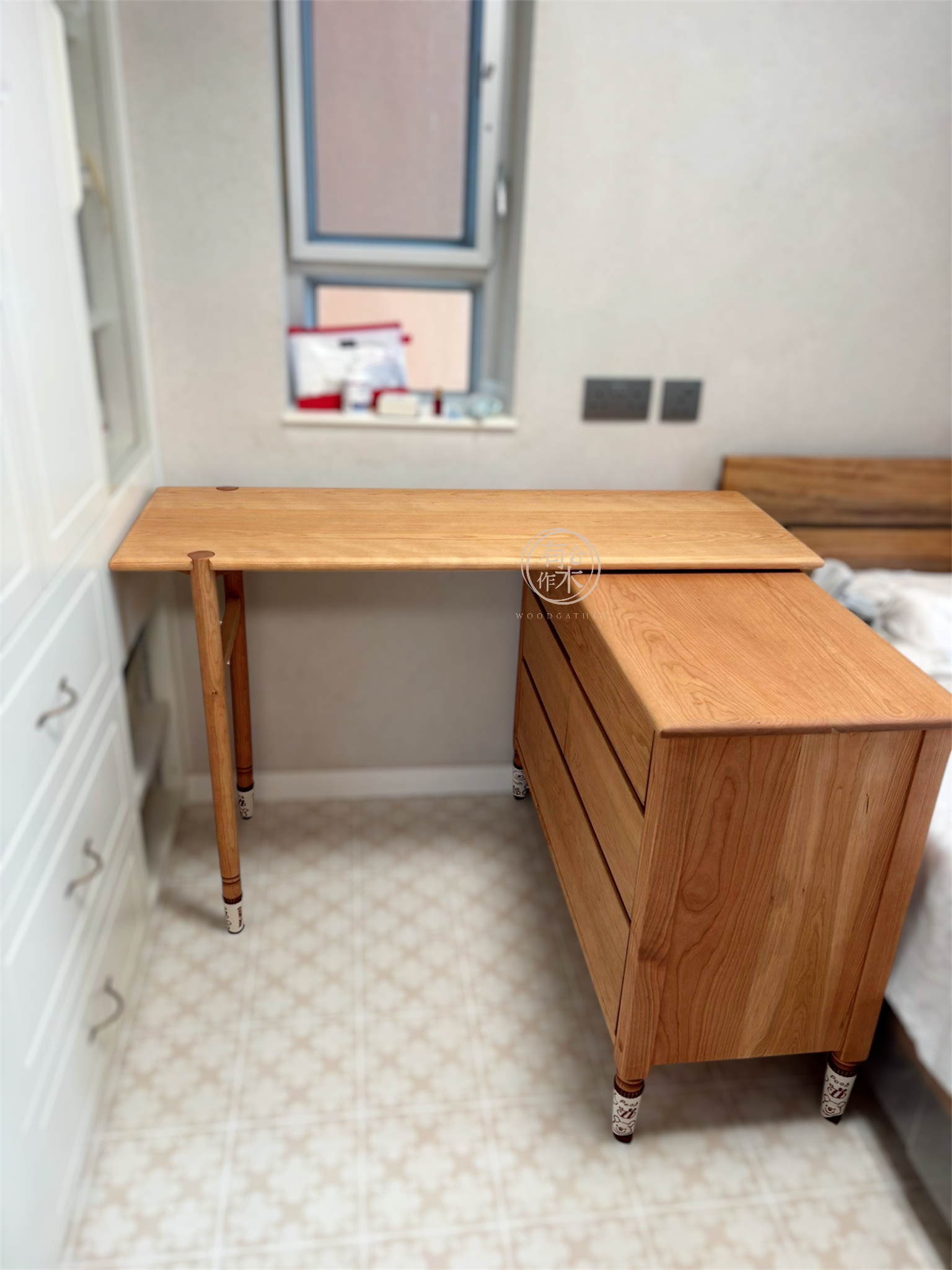 實木L形書桌連儲物櫃02,以美國櫻桃木(American Cherry Wood) 製作。搭枱可隨意移動,非工作時間可移返櫃面上,而儲物櫃亦提供了足夠的儲物空間。本店原有款式:「DELIGHT Desk 實木L形書桌」作基礎,調整款式及間隔。
