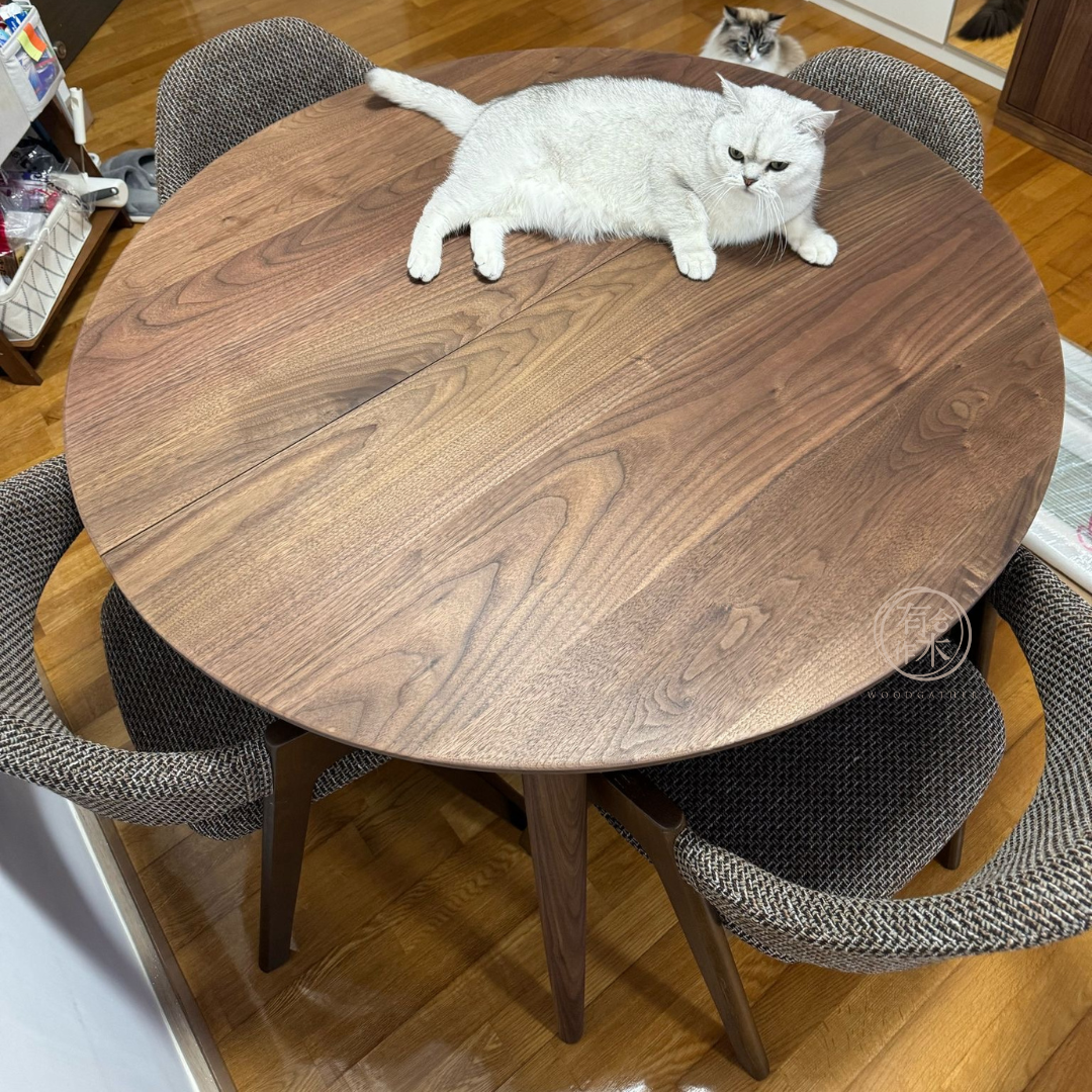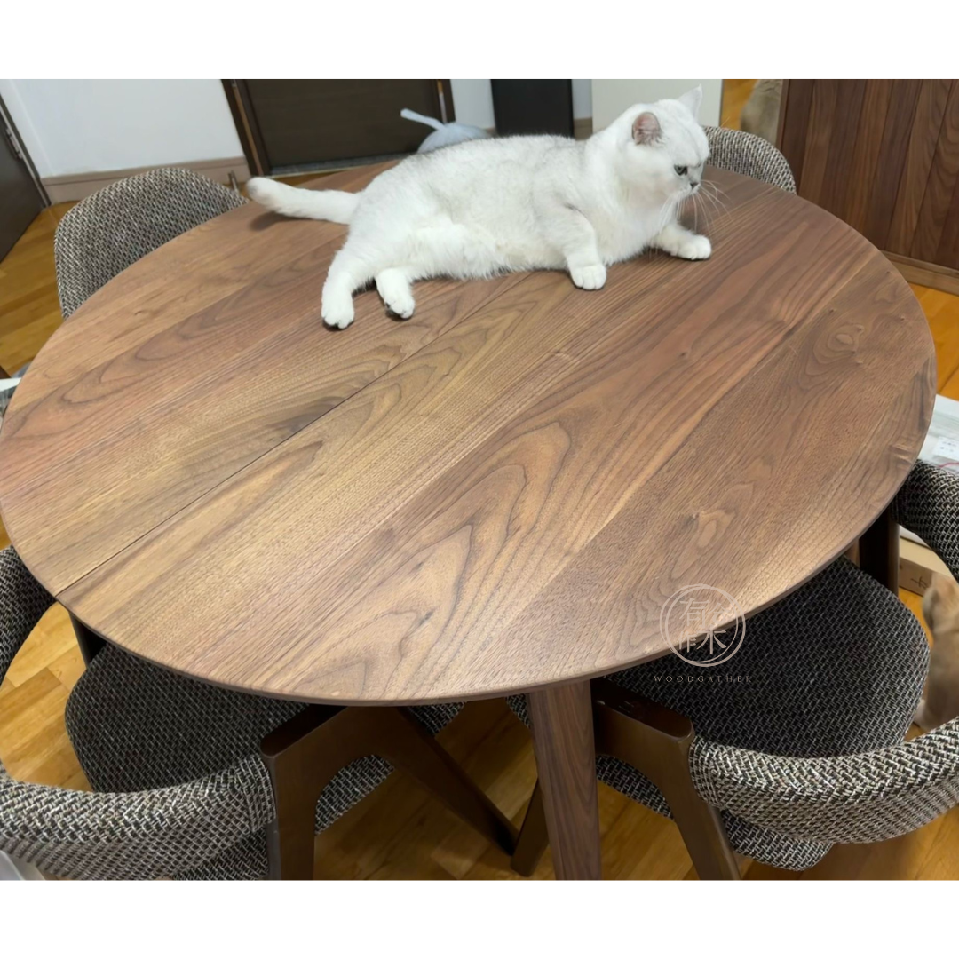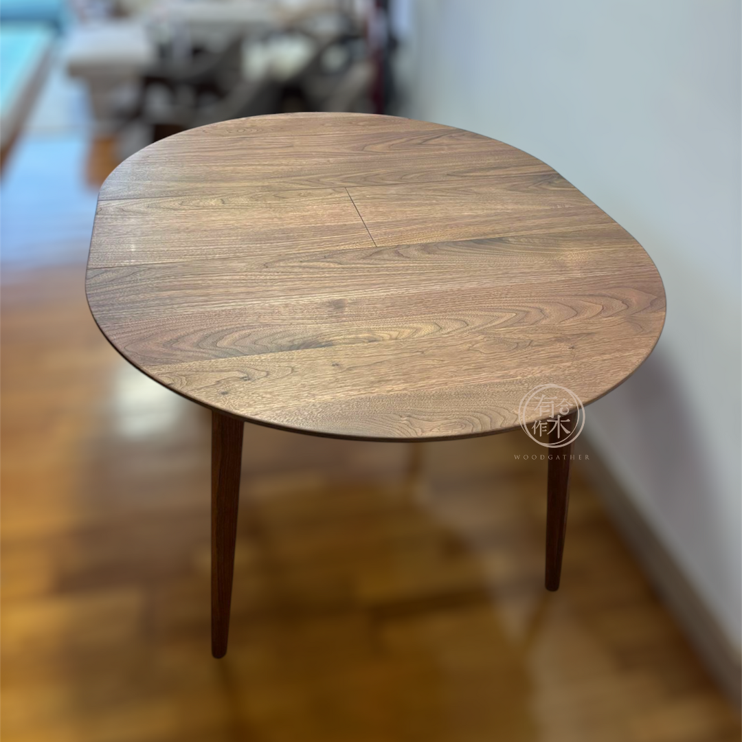 實木圓形開合餐枱,以美國胡桃木(American Walnut)製作。圓枱打開中間的延伸板,即成為橢圓形,擴大空間共敍天倫!