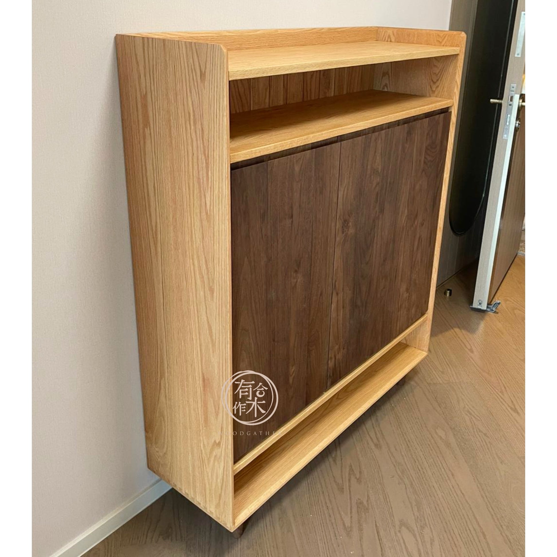 實木鞋櫃,櫃身以美國橡木(Oak)及櫃門、櫃腳以胡桃木(Walnut) 製作。櫃面有三邊的圍邊,防止小物件會掉到櫃後。中空一層可擺放出門物品(紙巾、鎖匙、消毒搓手液、尿袋等)。中間揭門區分左、右兩邊收納,下面中空層則放便擺放家居拖鞋更換。
