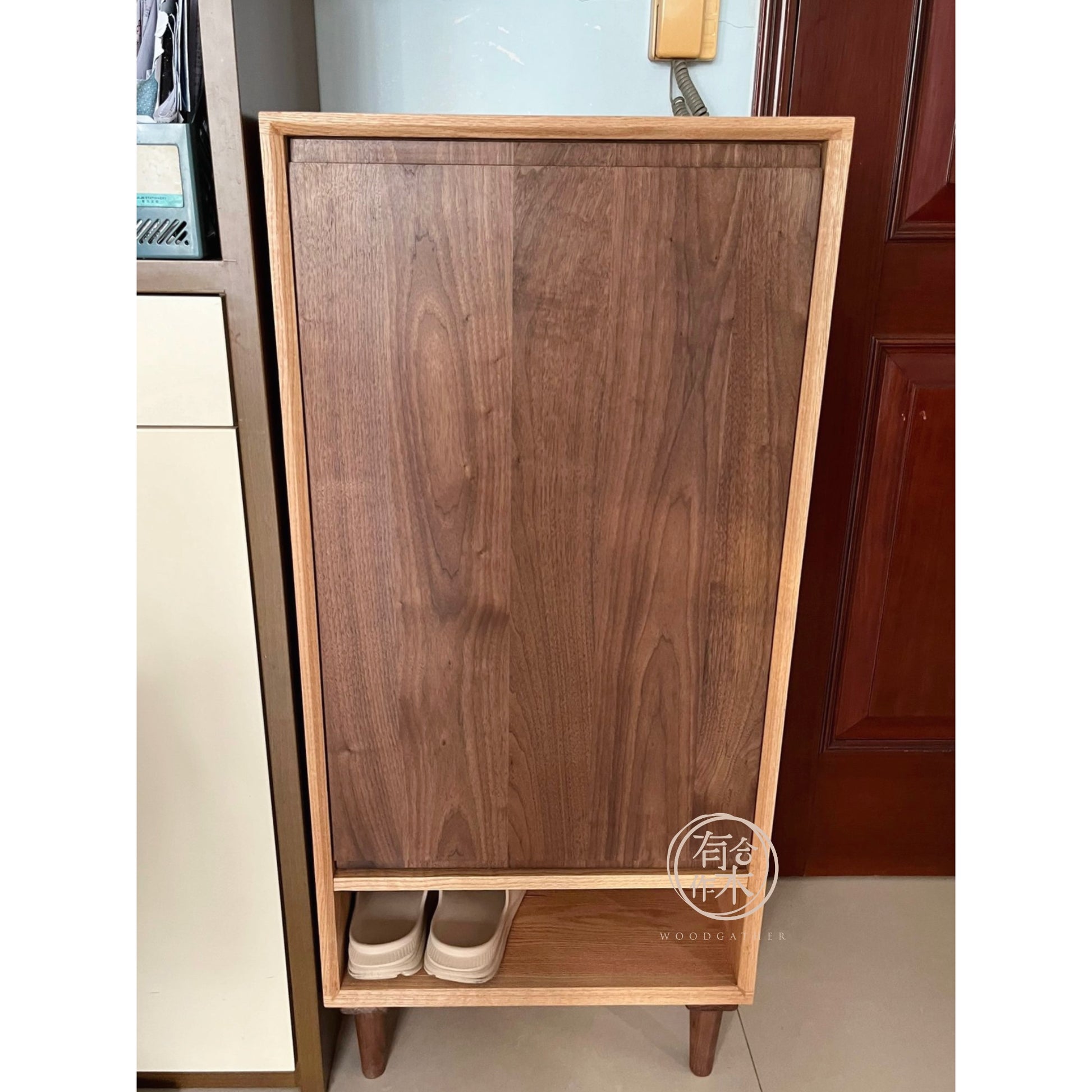 實木鞋櫃,櫃身以美國橡木(Oak)及櫃門、櫃腳以胡桃木(Walnut) 製作。單門設計,櫃內有5層儲鞋空間,層板都是活動式可調節的。