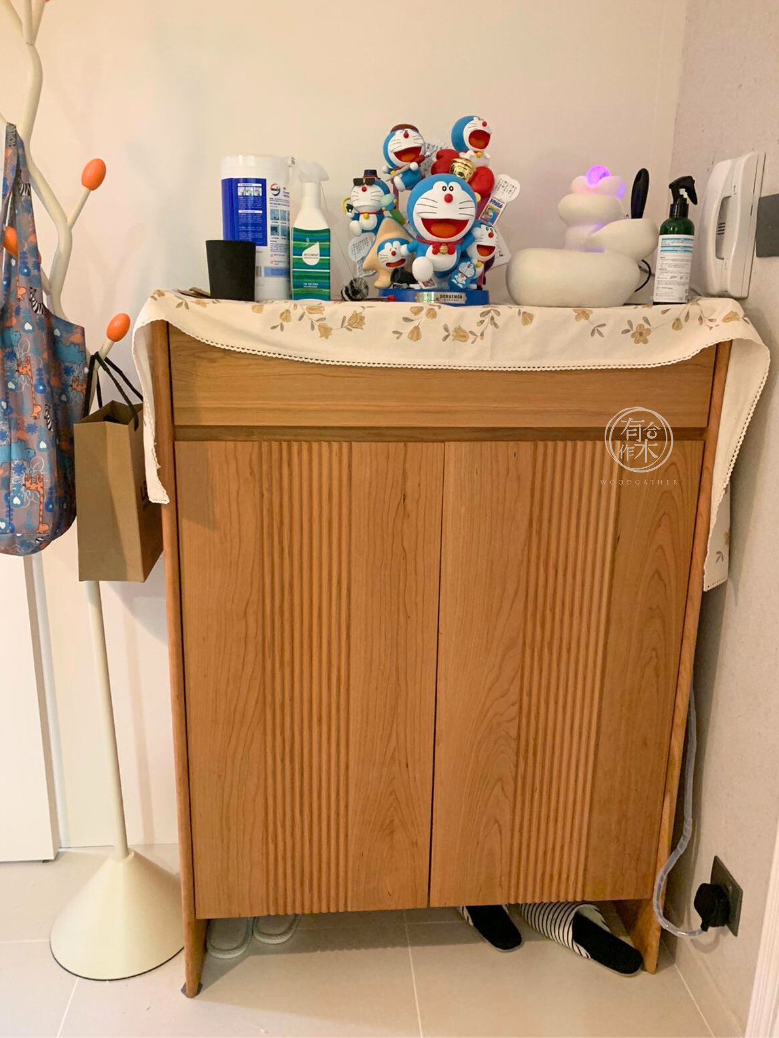 實木鞋櫃,以美國櫻桃木(American Cherry Wood)製作。最上方是1個大櫃桶,中間為開門,櫃內有活動層板存放鞋子。最下方中空則方便更換拖鞋!