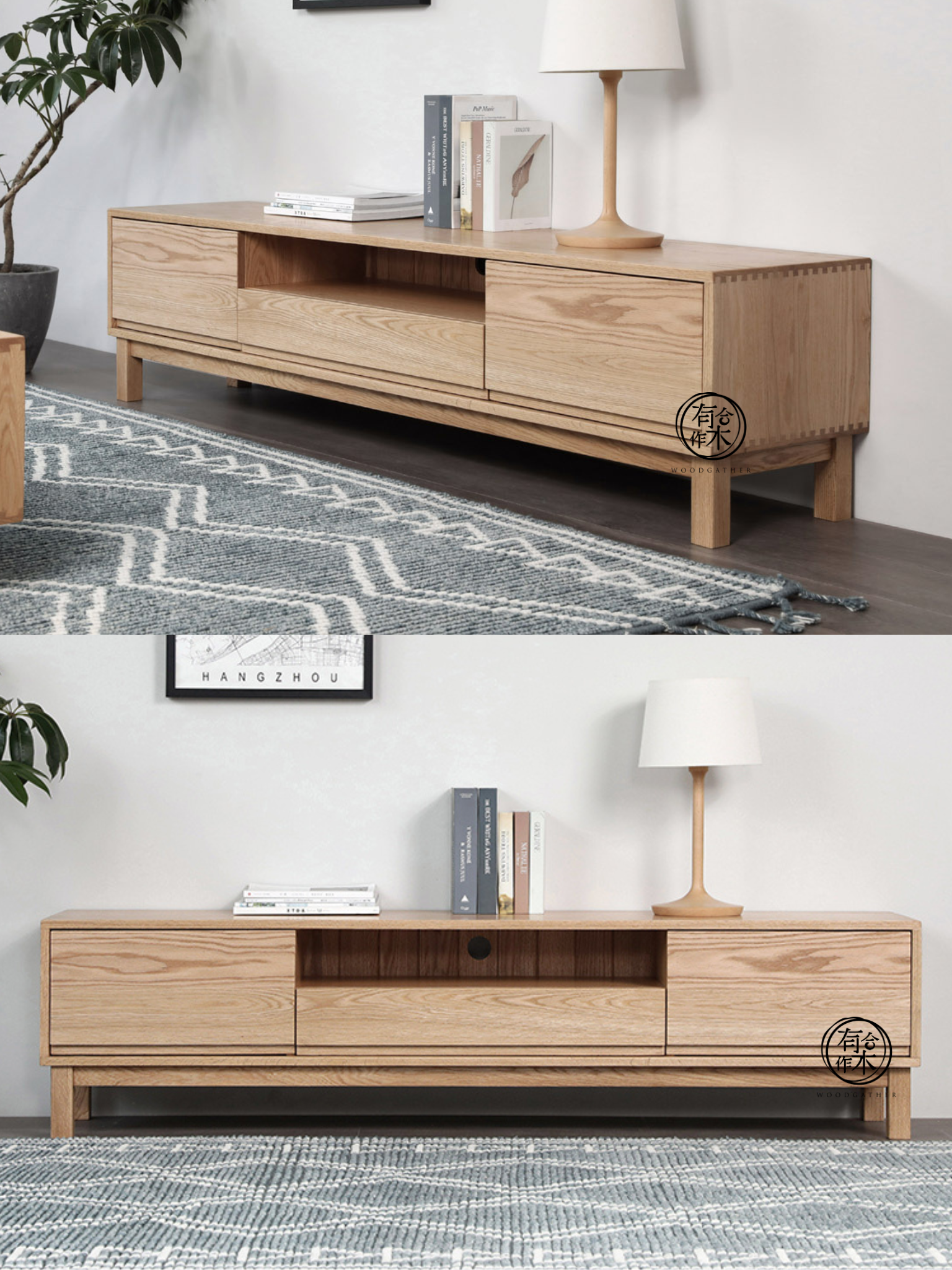 實木電視櫃,以美國橡木(Oak) / 胡桃木(Walnut) 製作。左右各一個大櫃桶,中間一個偏長的櫃桶,方便收納不同雜物。電視櫃腳是方形設計,感覺會較型格。